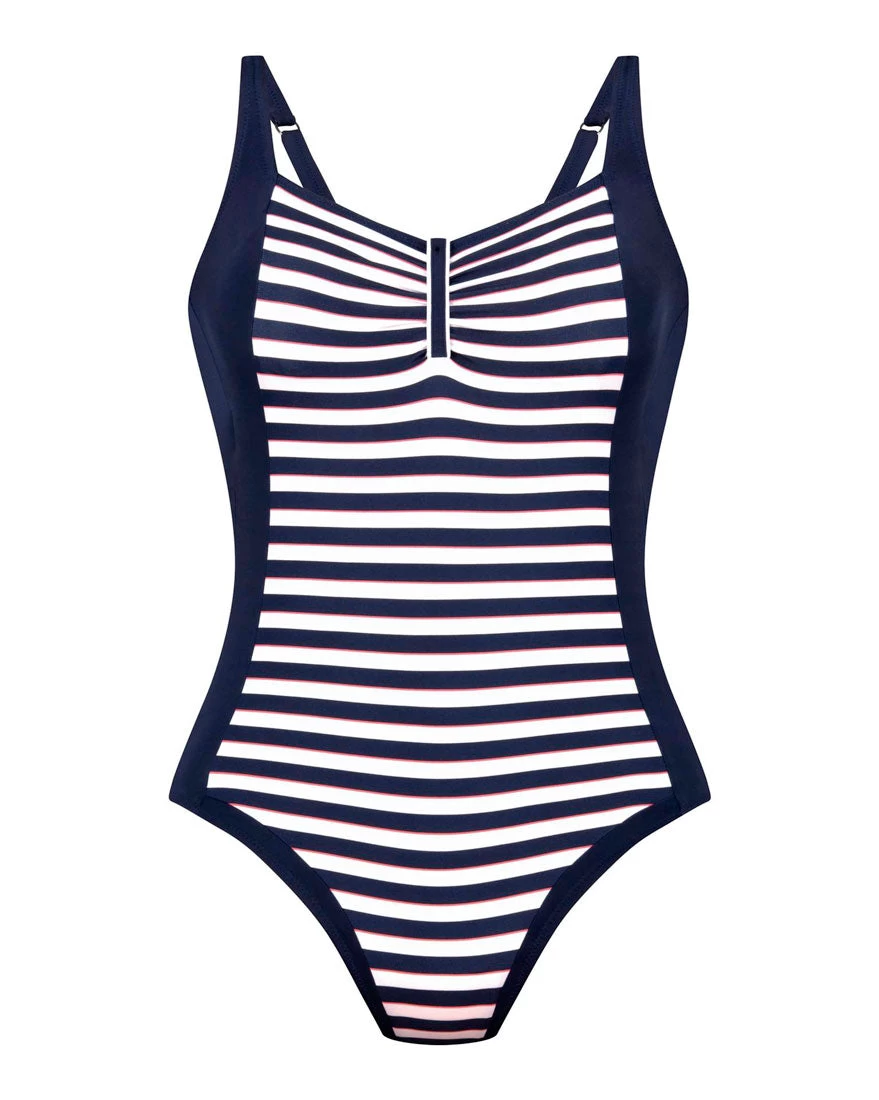 Badenixen aufgepasst! Der „Poolstripes“ Badeanzug Alena erscheint mit seitlichen, schlankmachenden Blenden im sportiven Vintage-Look. Übersäht mit trendigen Streifen hebt er seine Trägerin dank Teilungsnähten mit „slimming effect“ besonders schlankhervor. Ein formschöner Herzausschnitt mit feinen Raffungen verleihen dem Einteiler einen feinen Hauch Glamour.