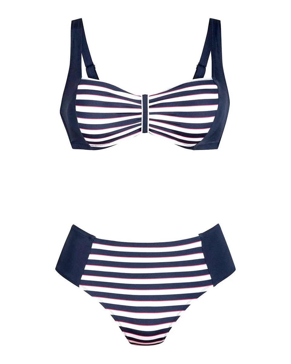 Ein maritimes Lieblingsstück! Der Bikini Selena schmückt sich mit einem trendigen Streifen-Print, der mit korallefarbenen Highlights moderne Eleganz verströmt. Mit feinen Raffungen im herzförmigen Ausschnitt zaubert der bügellose Zweiteiler eintraumhaftes Dekolleté. Die hohe Bikinihose mit Streifen im Vorderteil und seitlichen Uniblenden ergänzt das „Poolstripes“ Set perfekt.