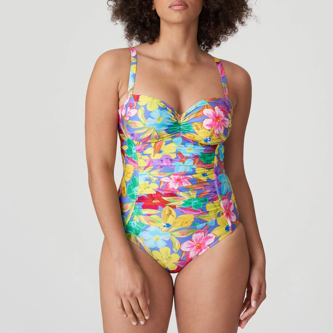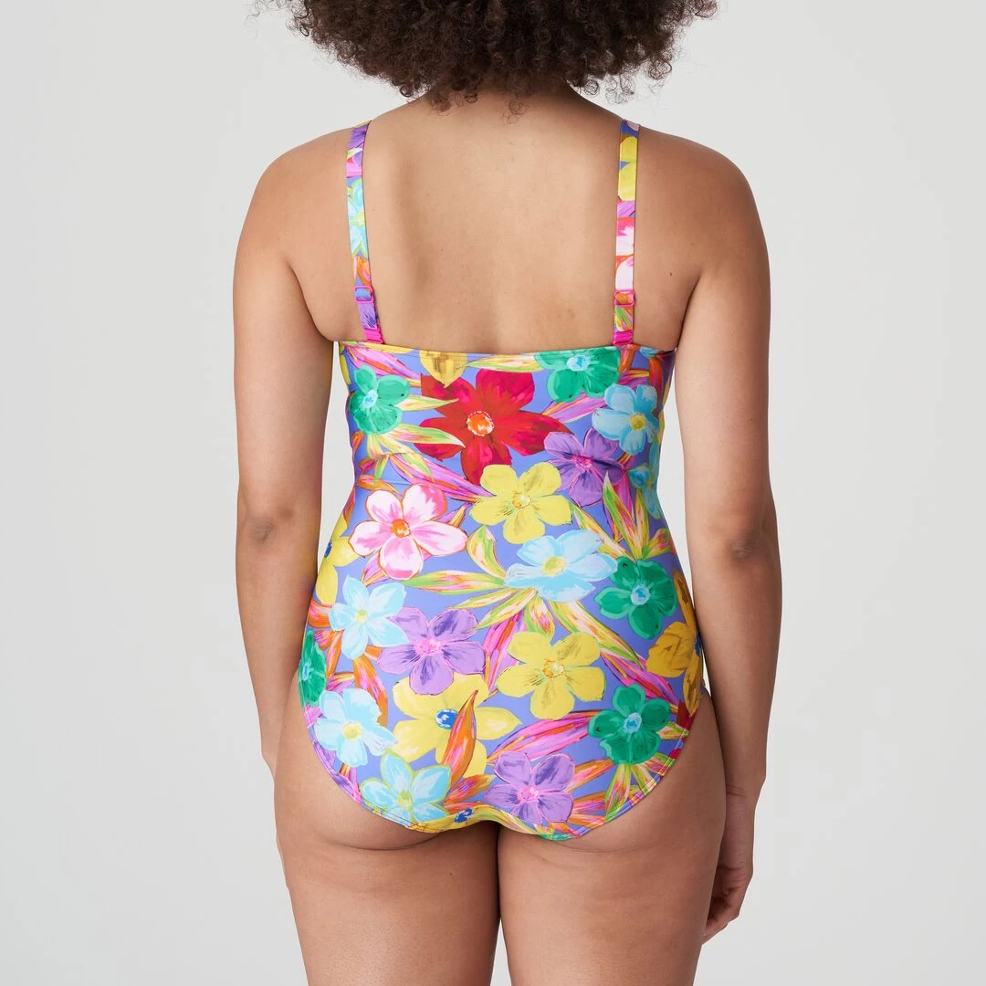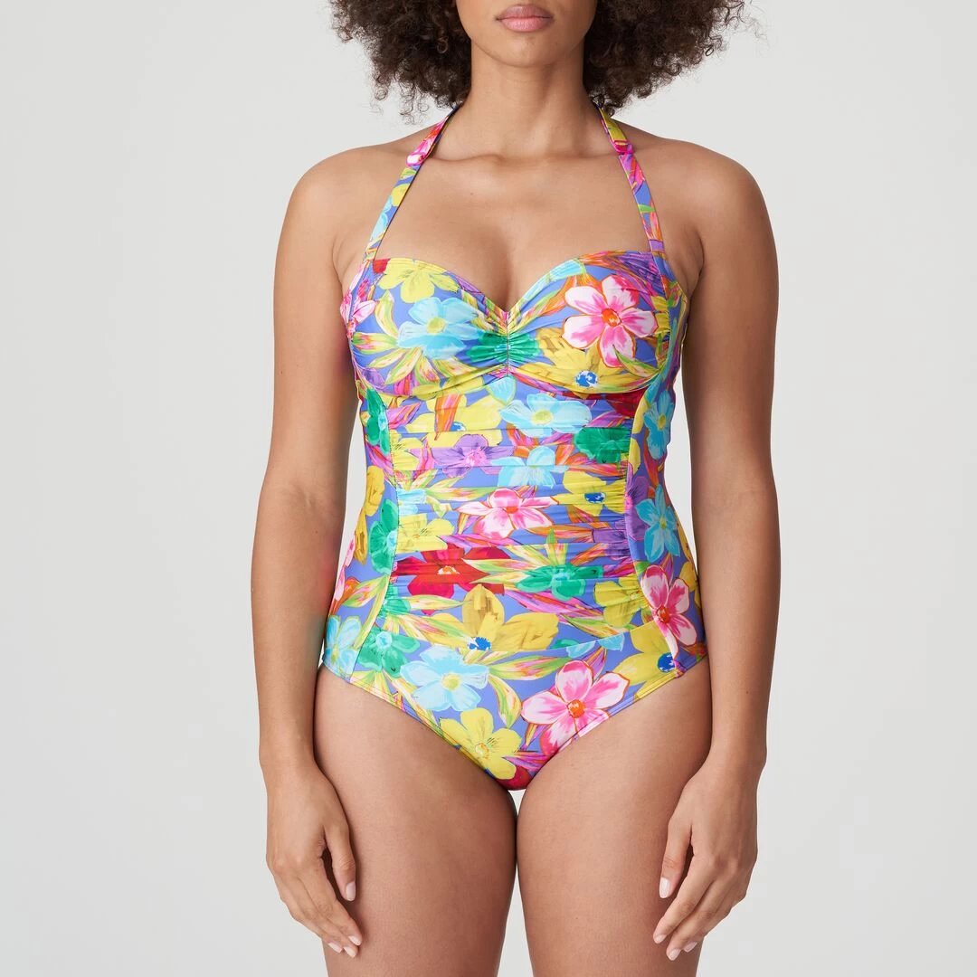 Angesagter figurformender Badeanzug, der auch als Neckholder-Modell getragen werden kann. Blue Bloom kombiniert leuchtendes Blau mit sonnigem Pink, Orange und Neonakzenten.