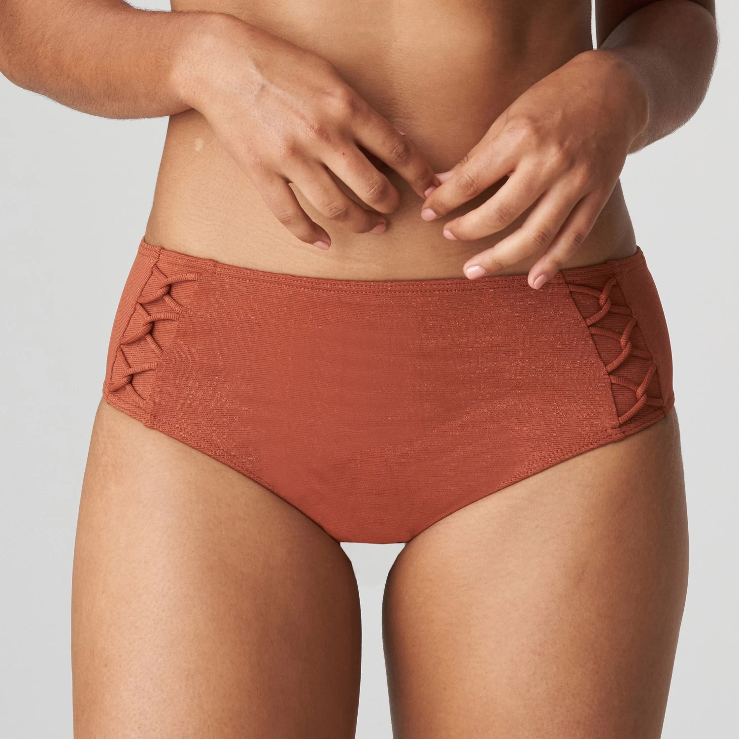Bikini-Oberteil mit angesagten Aussparungen an den Trägern und am Steg. Der leicht glänzende Stoff fängt das Sonnenlicht ein. Burnt Amber ist ein warmer Rostton mit leichtem Glanz.