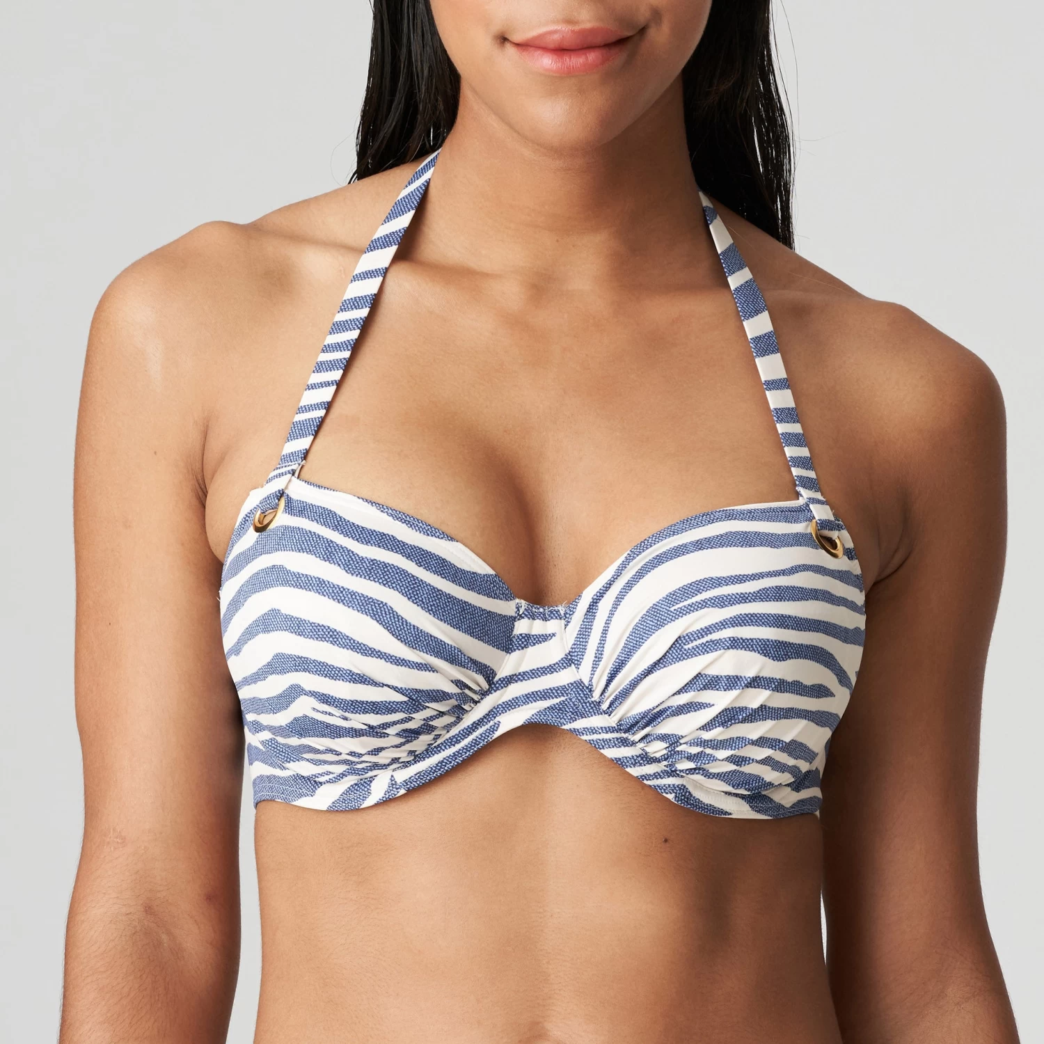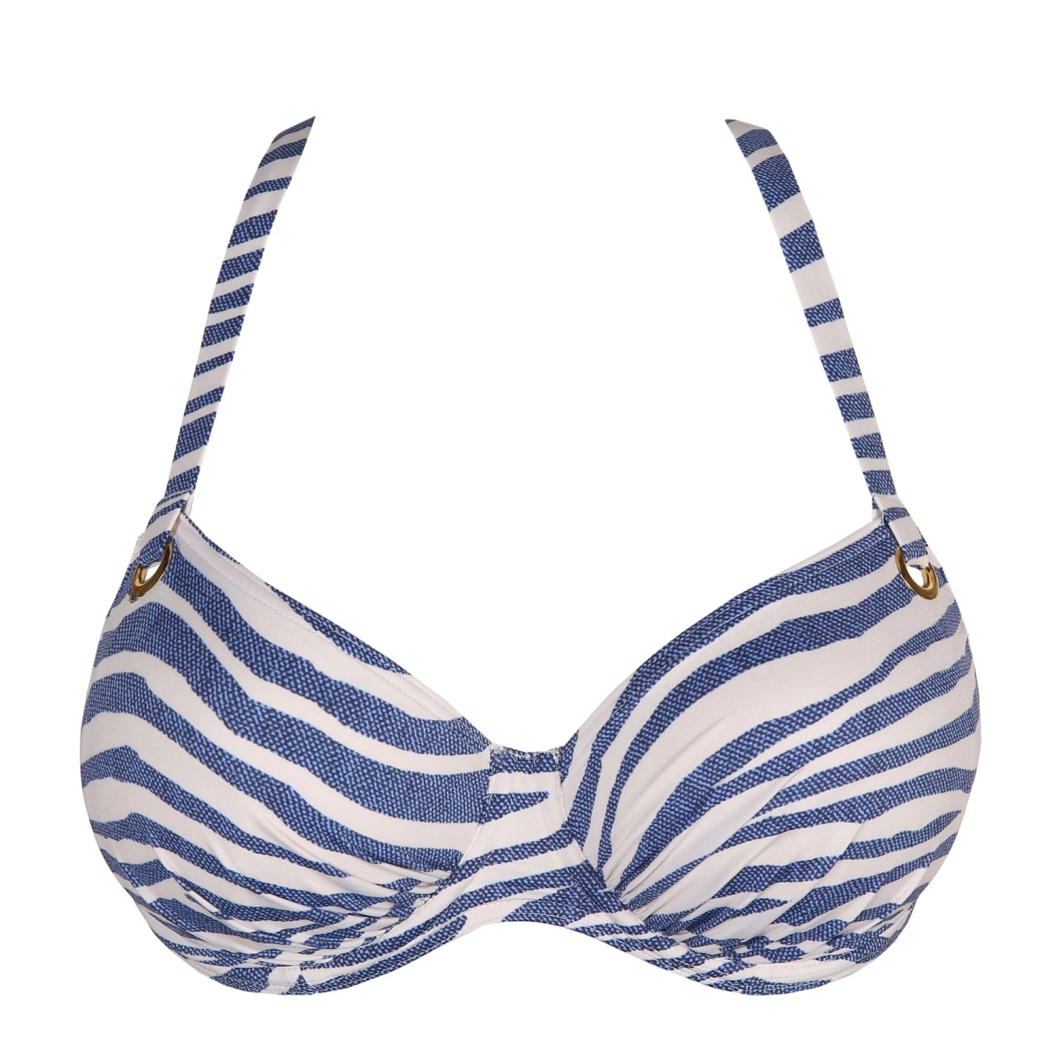 Glattes Bikini-Oberteil aus einem Bademodenstoff mit Denim-Look, mit Bügel und feinen Fransen an den Cups. Der gemusterte Stoff setzt sich in den Trägern fort, und die kupferfarbenen Ringe runden den Look ab. Denimblau mit Zebramuster: Adriatic Blue verleiht Ihnen einen angesagten Marinelook.