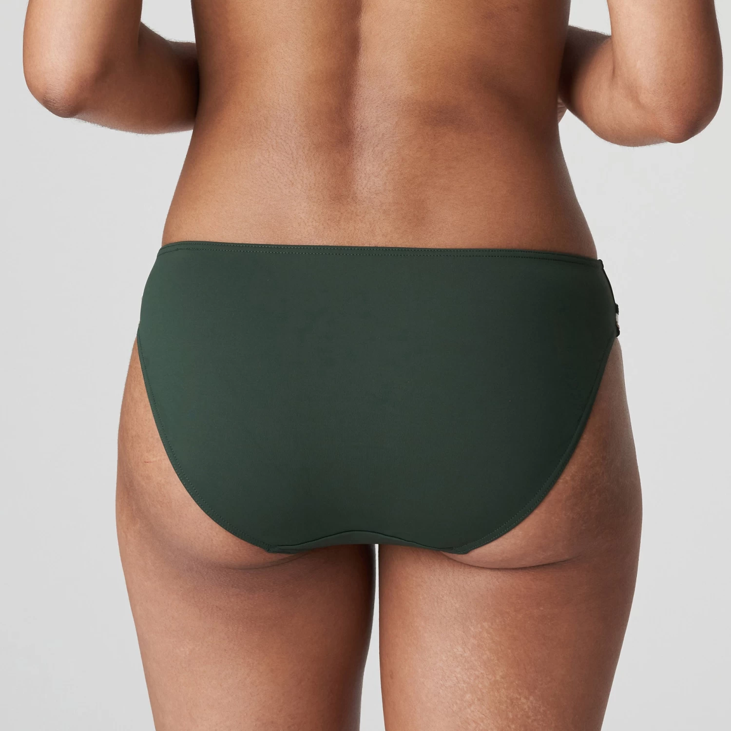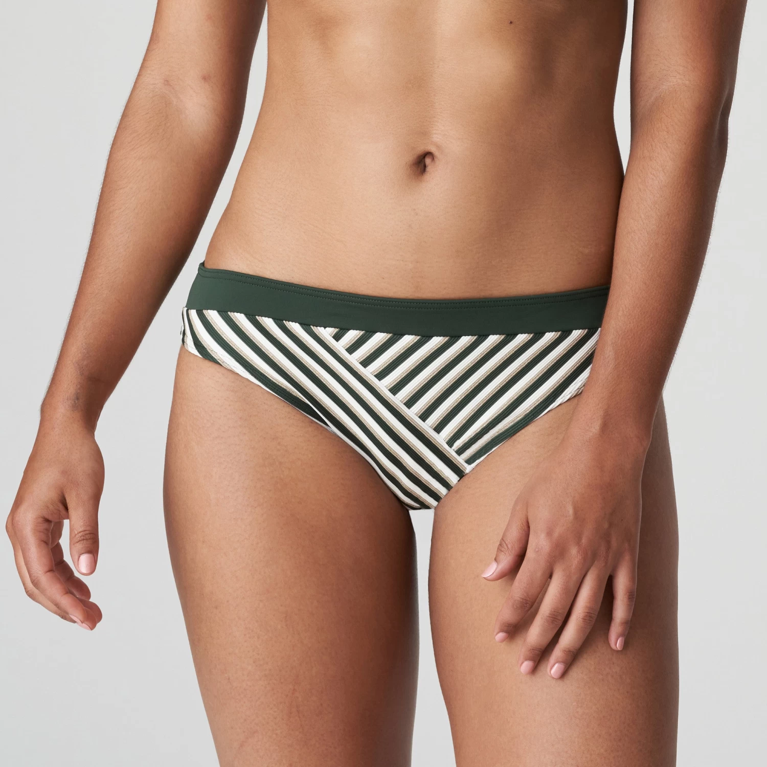 Stilvoller Bikinislip aus gestreiftem Material mit Linienstruktur. Der einfarbige Einsatz an der Taille wirkt wie ein eleganter Gürtel. Eine elegante Nuance, die zu jedem Teint passt: Malachit, eine schicke Kombination aus Dunkelgrün, Gold und gebrochenem Weiß.