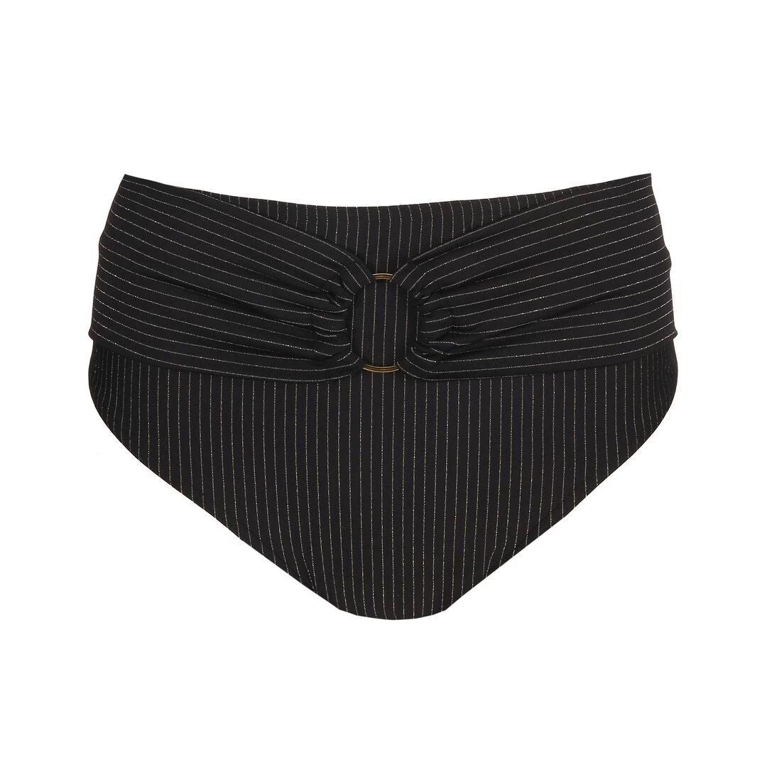 Modischer Bikini-Taillenslip aus einem Bademodenstoff mit eingewebten Glitzerstreifen. Die Drapierung mit goldfarbenem Ring zaubert eine elegante Taille. Zeitloses Schwarz mit goldfarbenem Schimmer, der das Sonnenlicht einfängt. Schick und anspruchsvoll!