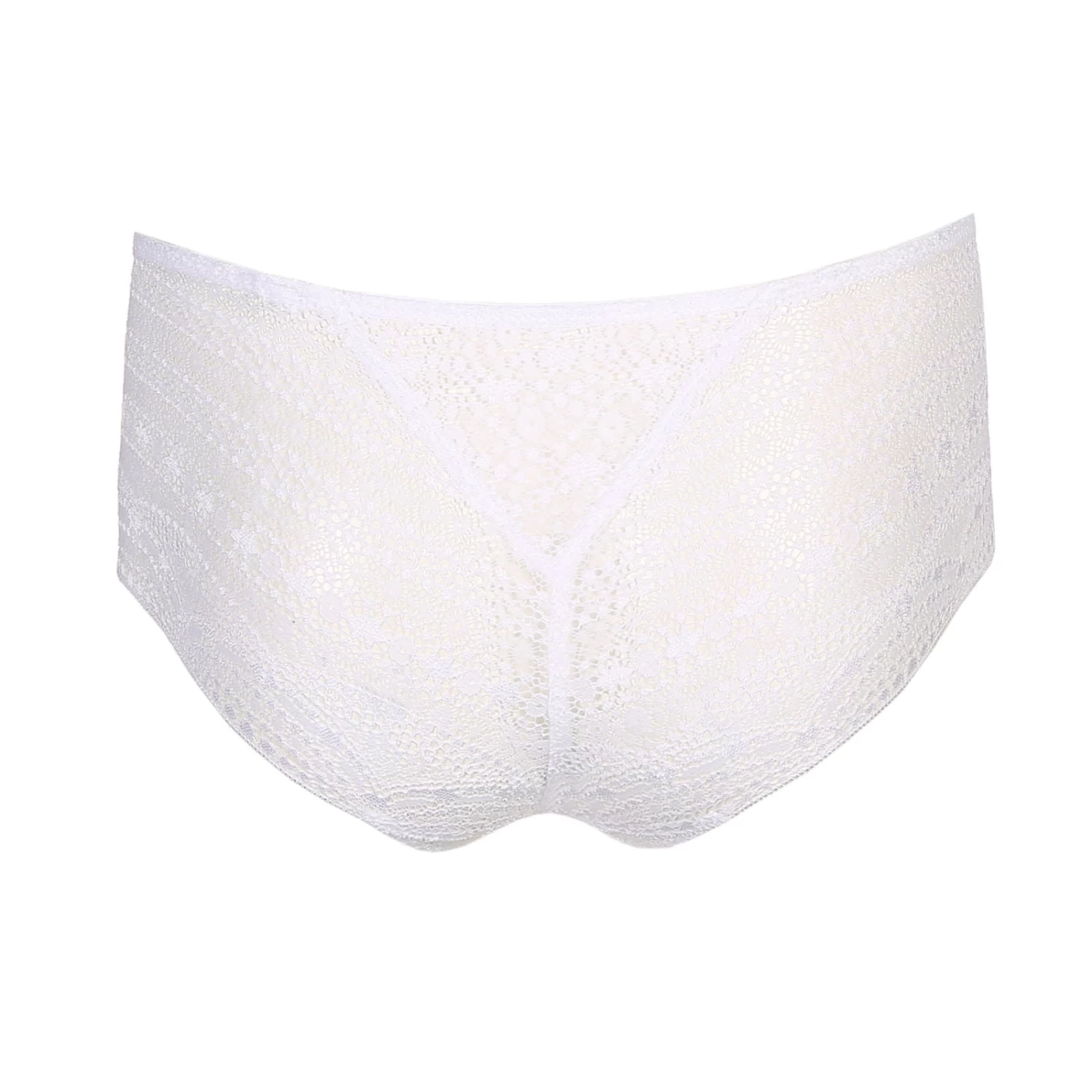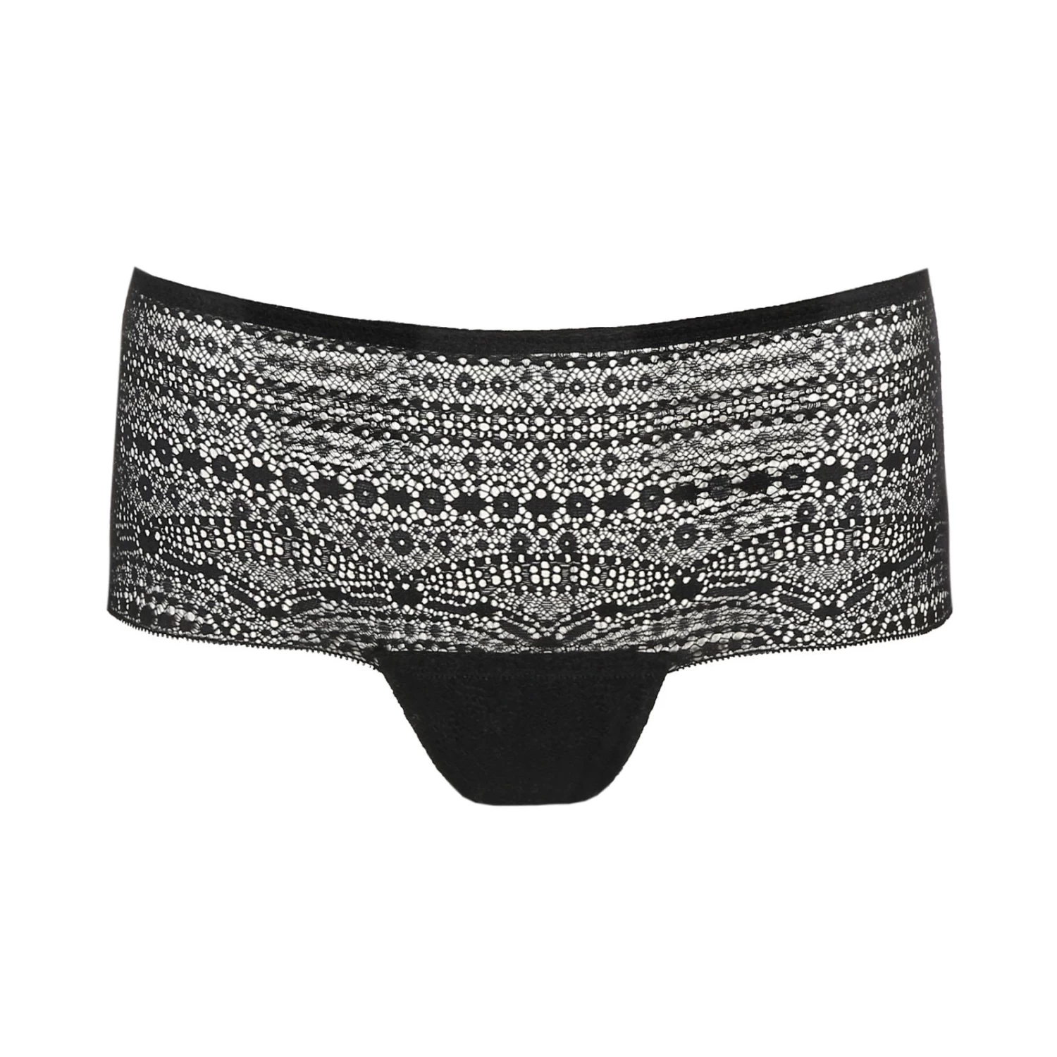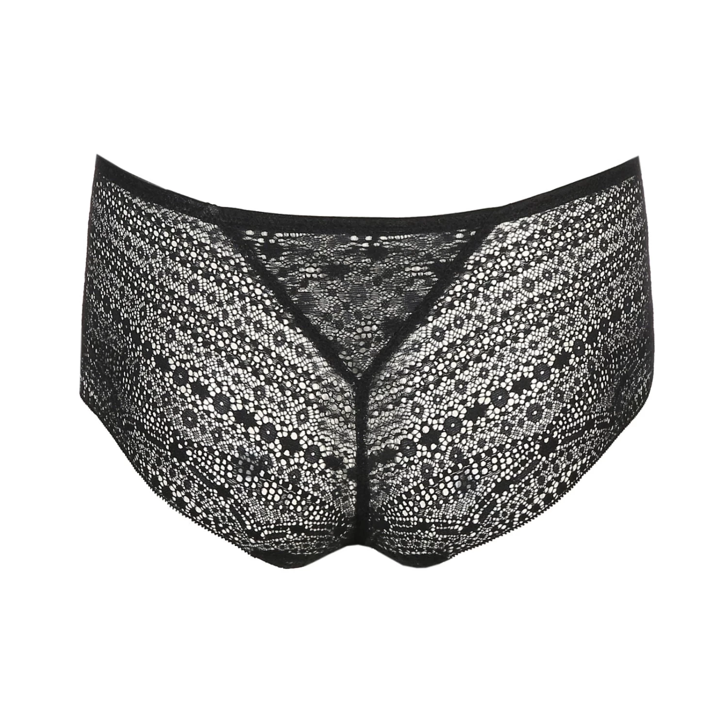 Hotpants aus cooler Seventies-Spitze und einem Stoff in Satinoptik. Reizvolle Wimpernspitze am Po rundet den Look ab.