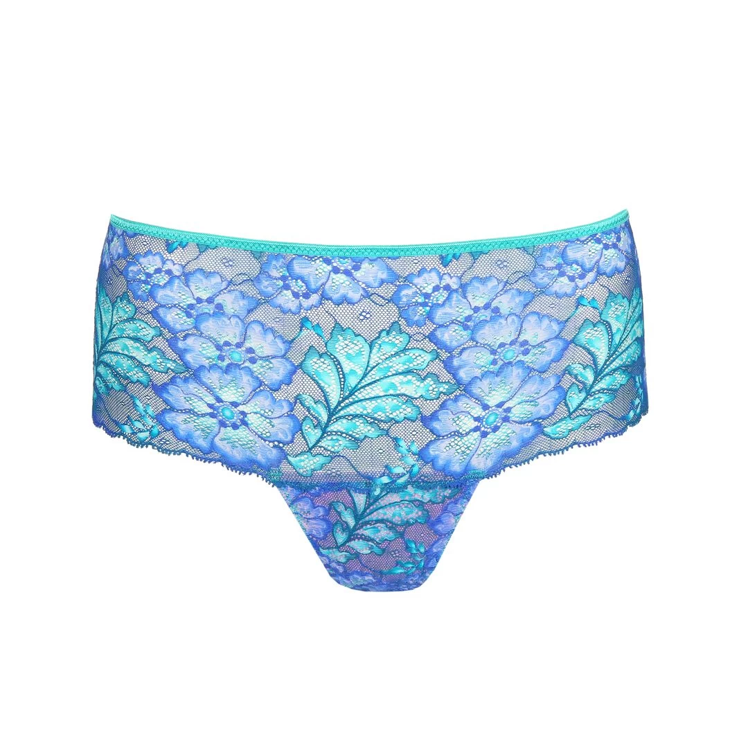 Hotpants aus farbenfroh bedruckter, recycelter Spitze: luftig und transparent, ohne Futter. Die sexy Schnürung an der Rückseite verleiht dem Korsett-Look den letzten Schliff. Mermaid Blue ist die Farbe des Atlantischen Ozeans an einem tropischen Tag. Sommerlich mit angesagtem Retro-Flair!