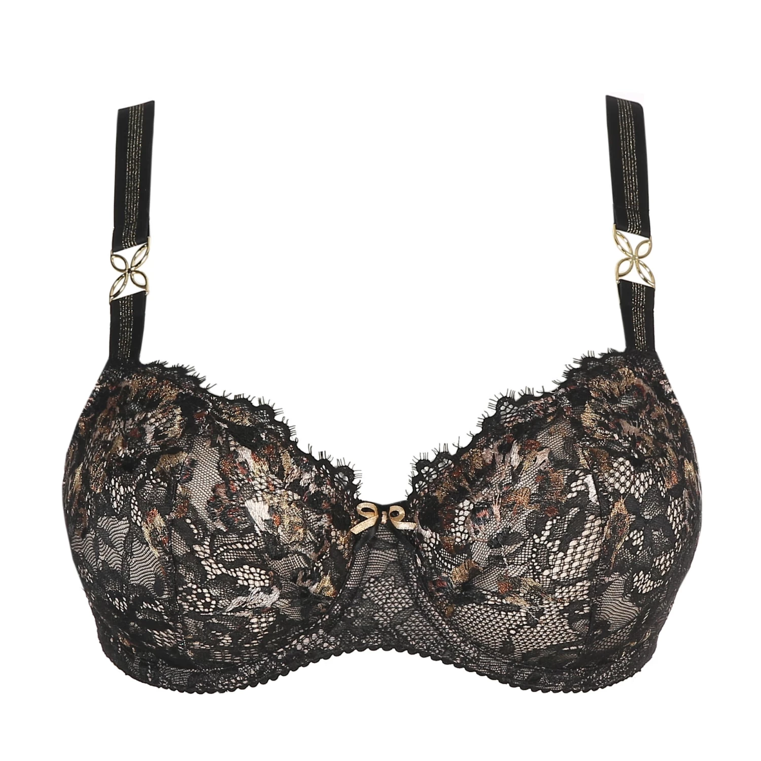 Dieser Balconette-BH mit Allover-Spitze ist außerordentlich festlich und schick. Der BH ist mit Stickerei mit Leopardenmuster verziert. In die Träger sind glänzende Streifen eingearbeitet, und ein goldfarbenes Zierelement sorgt für eine elegante Note. Schwarze Allover-Spitze, verziert mit Stickerei mit Leopardenmuster. Aufregend und schick!