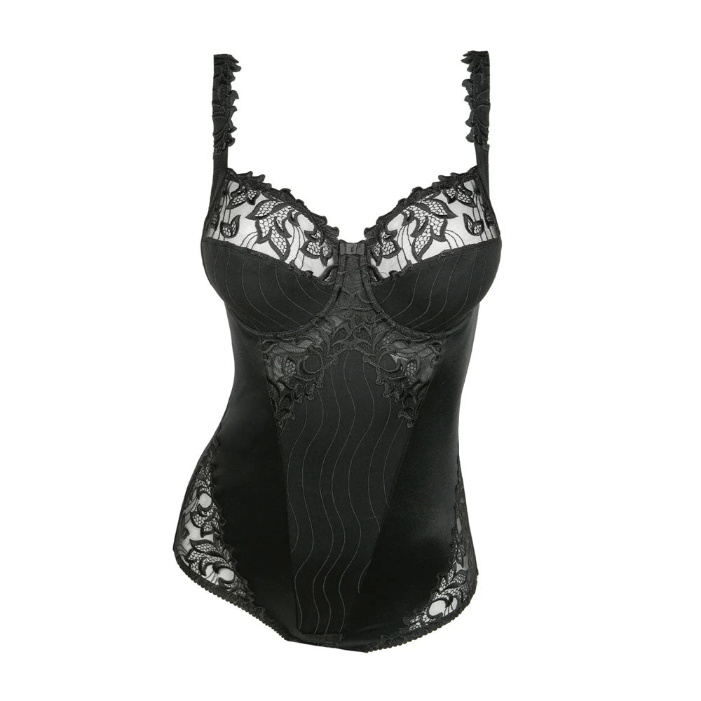 Luxuriöser figurformender Body mit dreiteiligem Bügel-BH, verschwenderisch mit Spitze an den Cups, den Bändchen, an den Beinabschlüssen und am Rumpf verziert. Die festen Cups heben den Busen, während die Seitenteile ihn schön zentrieren. Das höhere Seitenteil fängt mehr vom Busen auf und stützt ihn zusätzlich. Außerdem sind die Cups tiefer geschnitten als bei den anderen PrimaDonna-BH, sodass sie den Busen noch besser heben können. Sie modellieren auch besonders große Busen und verleihen ihnen eine glatte und runde Silhouett. Der Rumpf korrigiert Unebenheiten am Bauch und an der Taille. Die Silhouette ist fließend