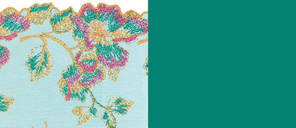 Luxuriöser Vollschalen-BH mit üppiger Allover-Stickerei, zarter Guipure in den Trägern und einer Perle vorn in der Mitte. Die Stickerei setzt sich oben elegant fort, so dass die oberen Cups nahtlos anliegen und für ein schönes Dekolleté sorgen. Sunny Teal ist ein tropisches Grün mit ockerfarbenen und fuchsiafarbenen Akzenten. Schmeichelhaft für helle und dunkle Hauttypen.