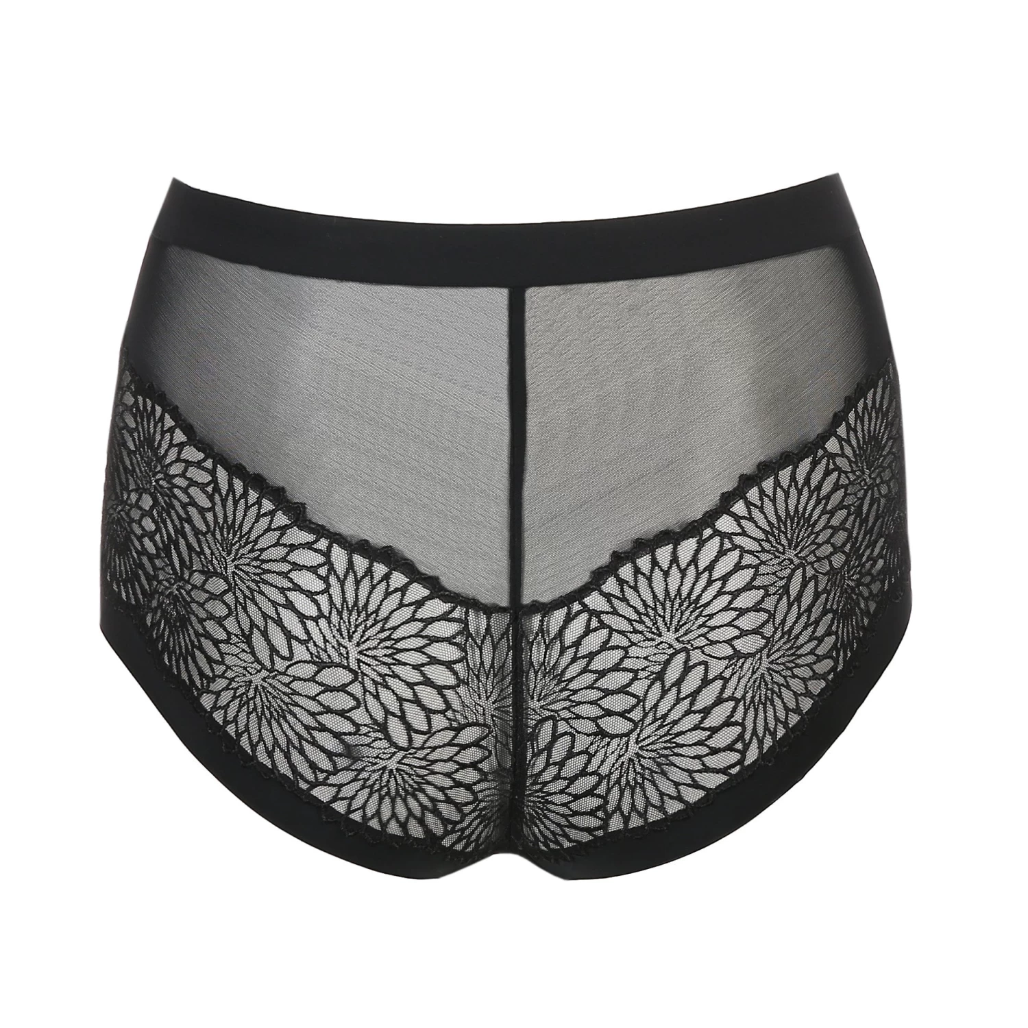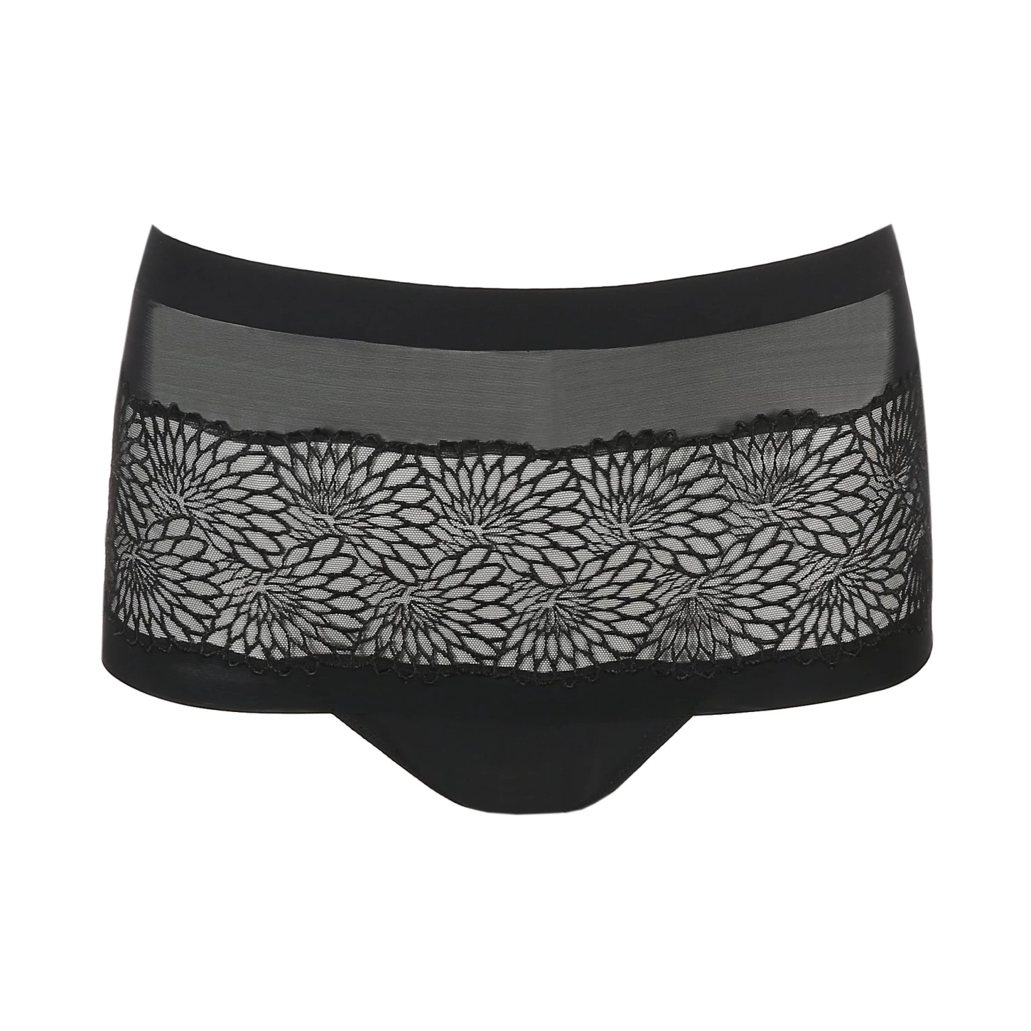 Hotpants mit aufregendem Retro-Look, verziert mit schwarzer Stickerei auf hautfarbenem Tüll. Schwarze Dessous mit reizvollem Tattoo-Effekt!