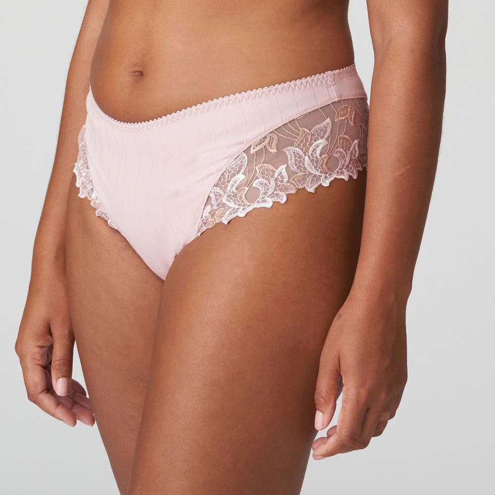 Schicker Luxusstring mit reichhaltiger Stickerei an den Beinen. Vintage Pink ist ein puderrosa Farbton mit dezenter dreifarbiger Stickerei. Trendig, schmeichelhaft und unsichtbar unter weißer Kleidung.