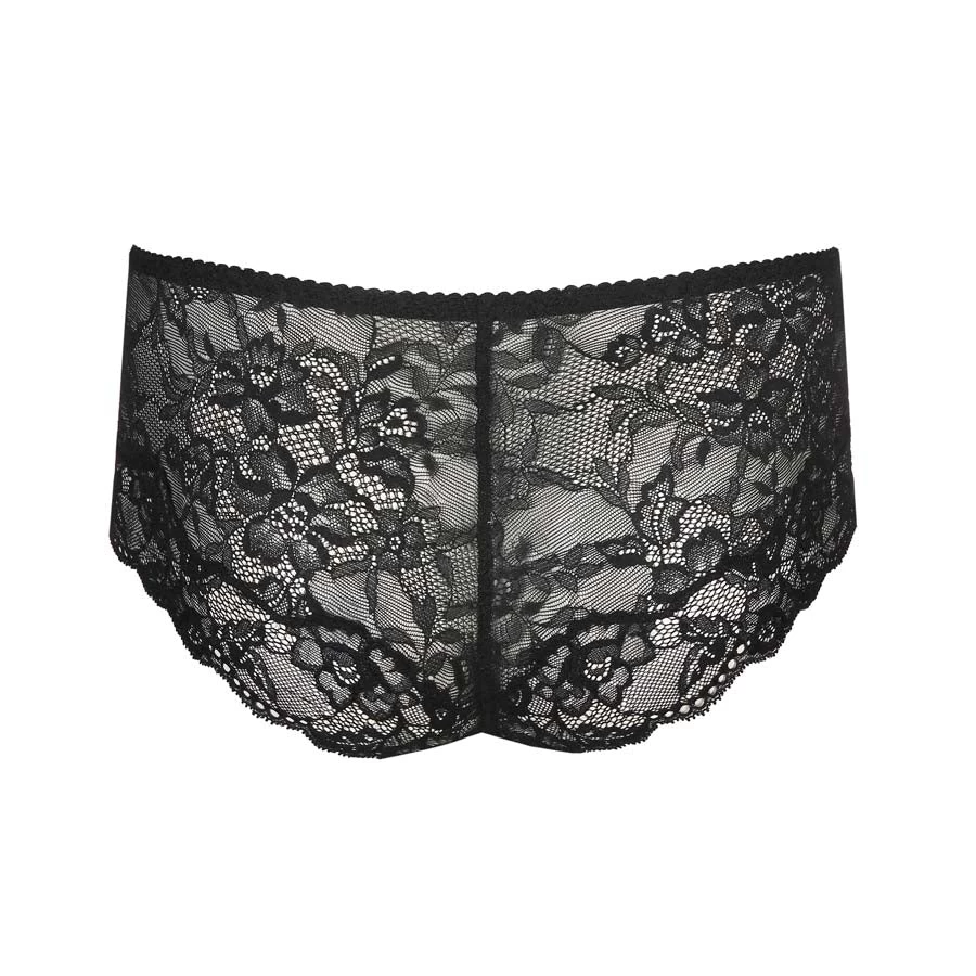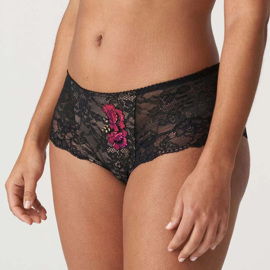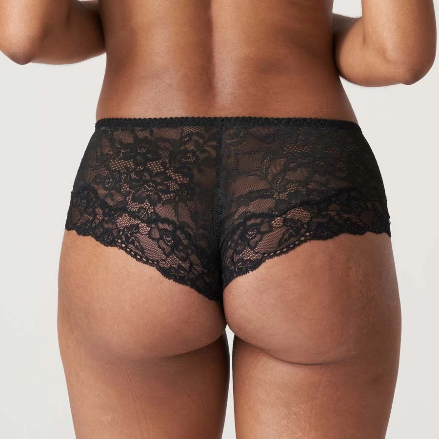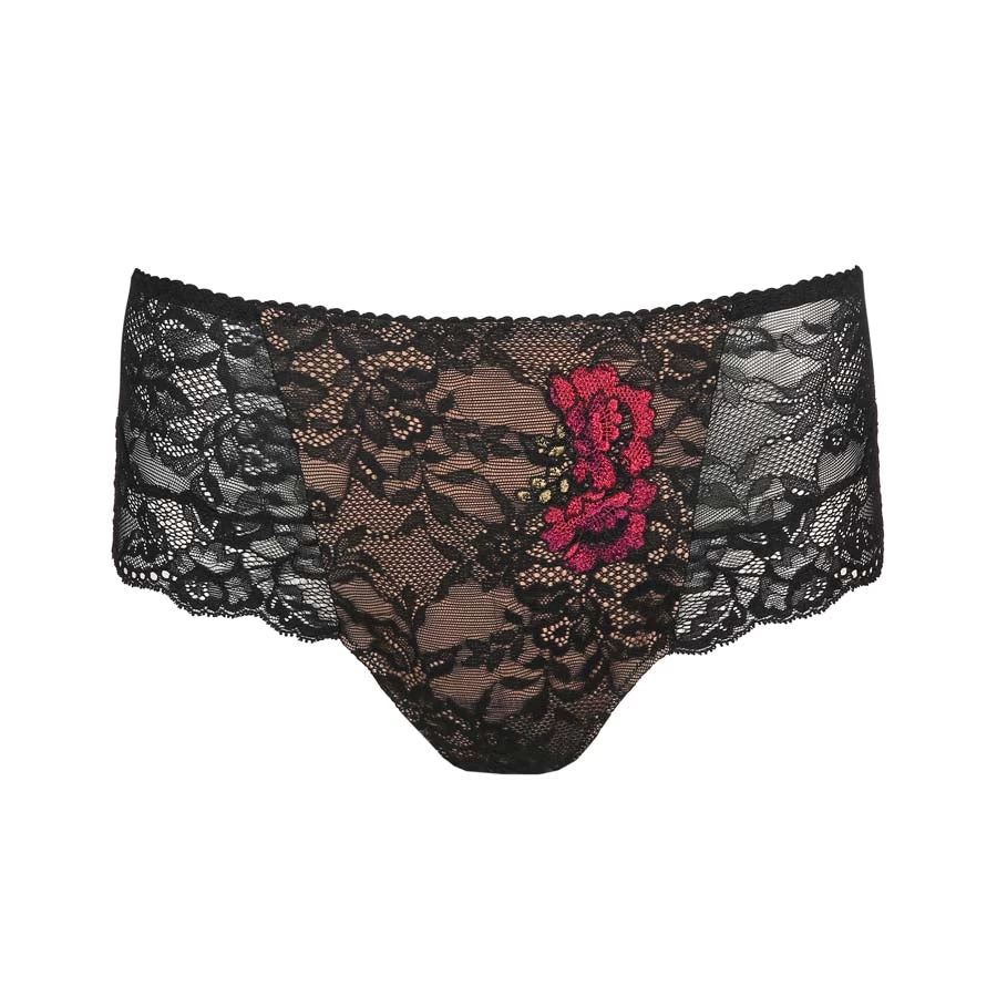 Edler String ganz aus Spitze mit schicker Rosenstickerei. Verführerisch transparent am Gesäß, doppelte Stoffschicht vorne. Schwarze Spitze und rote Rosenstickerei für den sinnlichen Boudoir-Look.