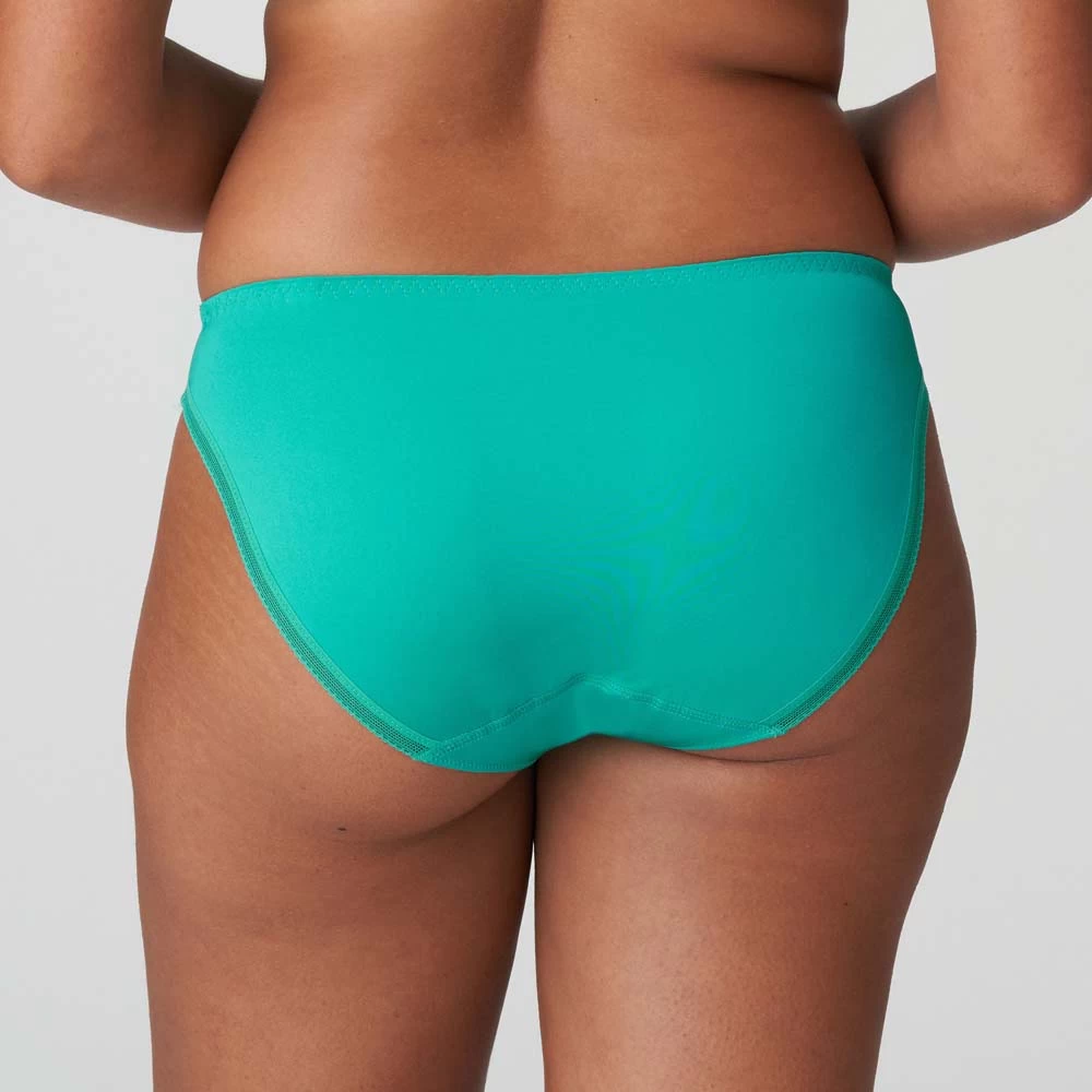 Rio-Slip aus weicher Mikrofaser und luxuriöser Stickerei in einer Kontrastfarbe. Sunny Teal ist ein tropisches Grün mit ockerfarbenen und fuchsiafarbenen Akzenten. Schmeichelhaft für helle und dunkle Hauttypen.