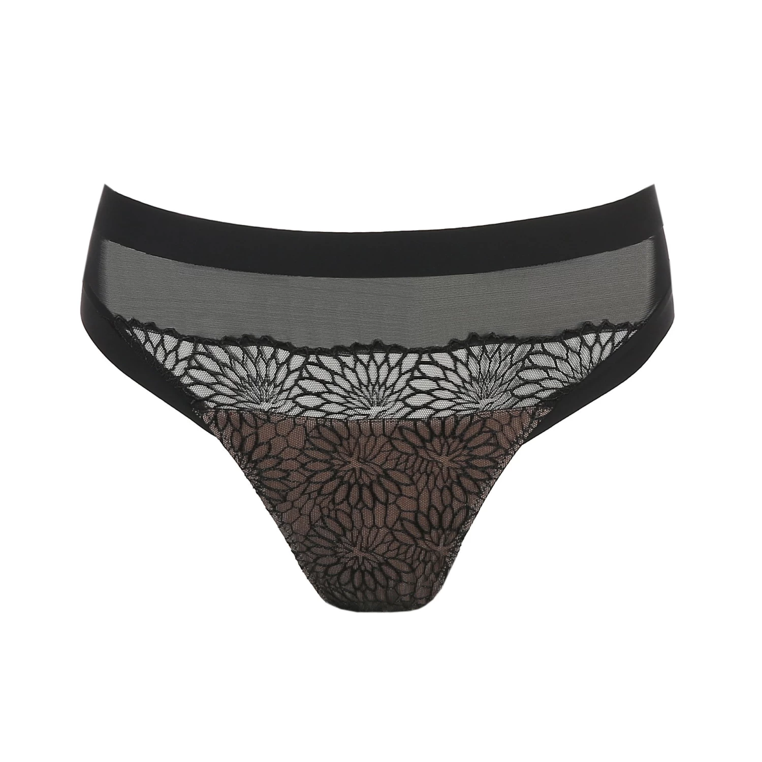 Rioslip aus hautfarbenem Tüll mit schwarzer Stickerei. Für einen gewagten Tattoo-Look! Schwarze Dessous mit reizvollem Tattoo-Effekt!
