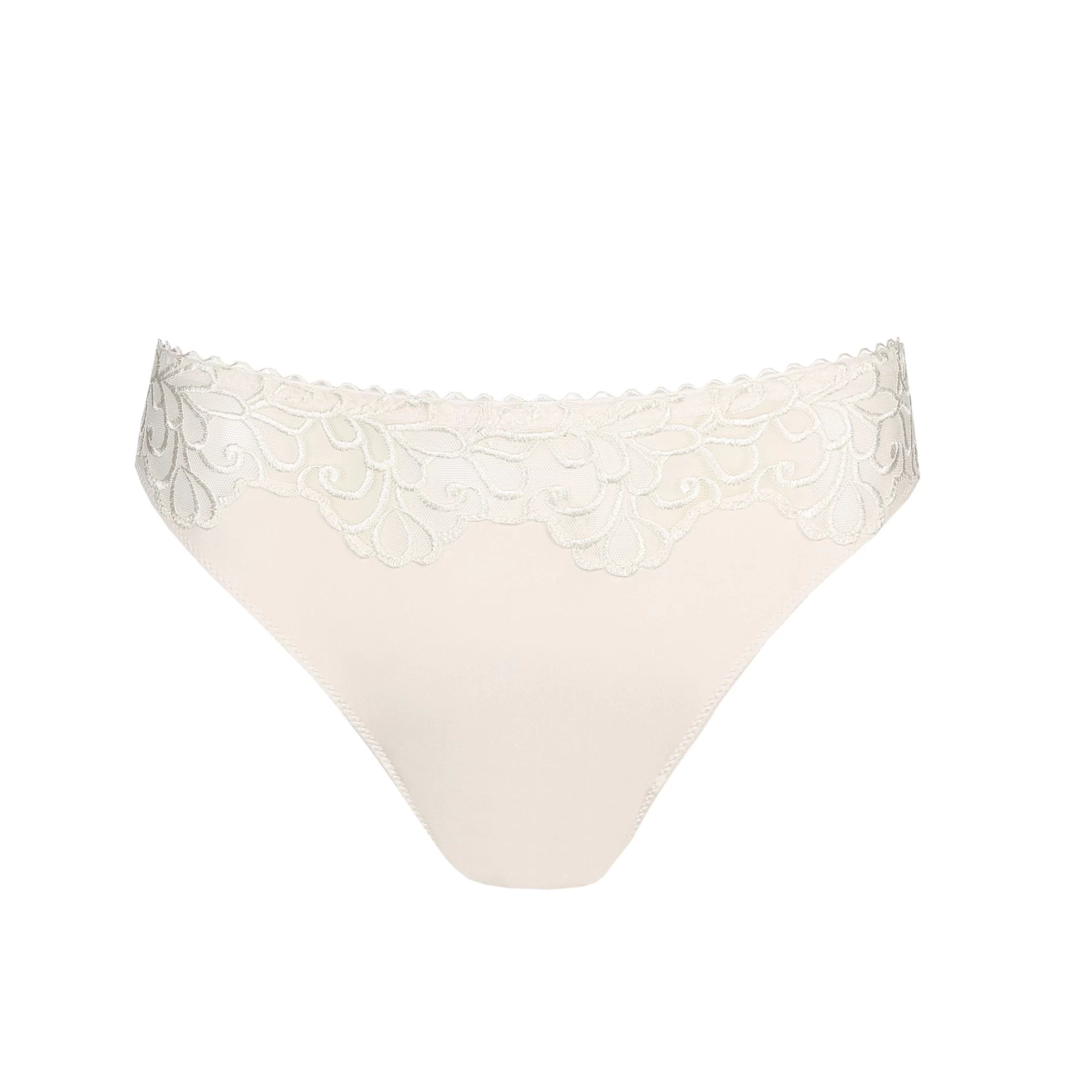 Femininer Rioslip aus einem weichen gemusterten Stoff mit Stickereieinsätzen an der Vorderseite. Der feminine Naturton bildet einen sanften Kontrast zu Ihrer Haut und passt unter all Ihre hellen Sommeroutfits. Pure Eleganz!