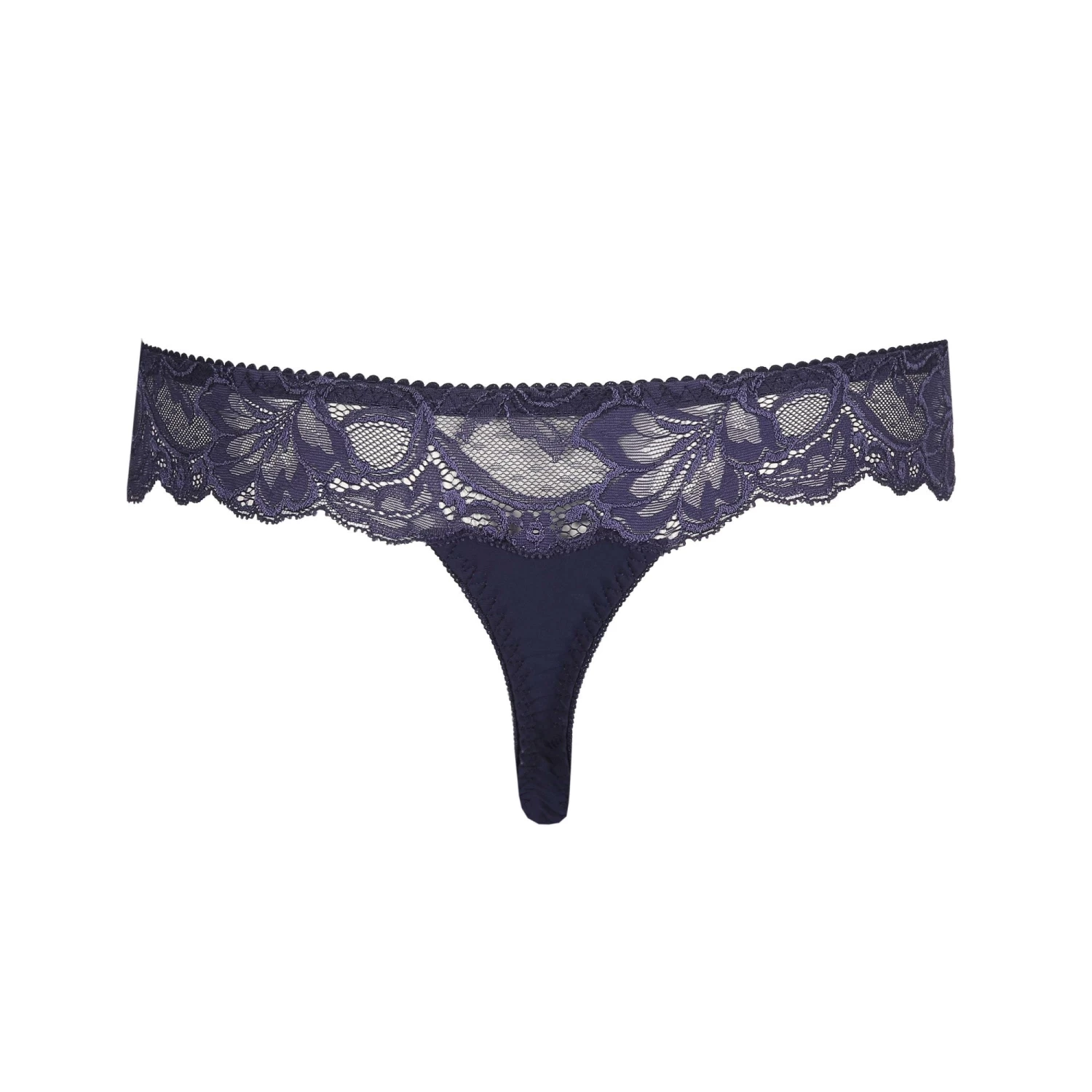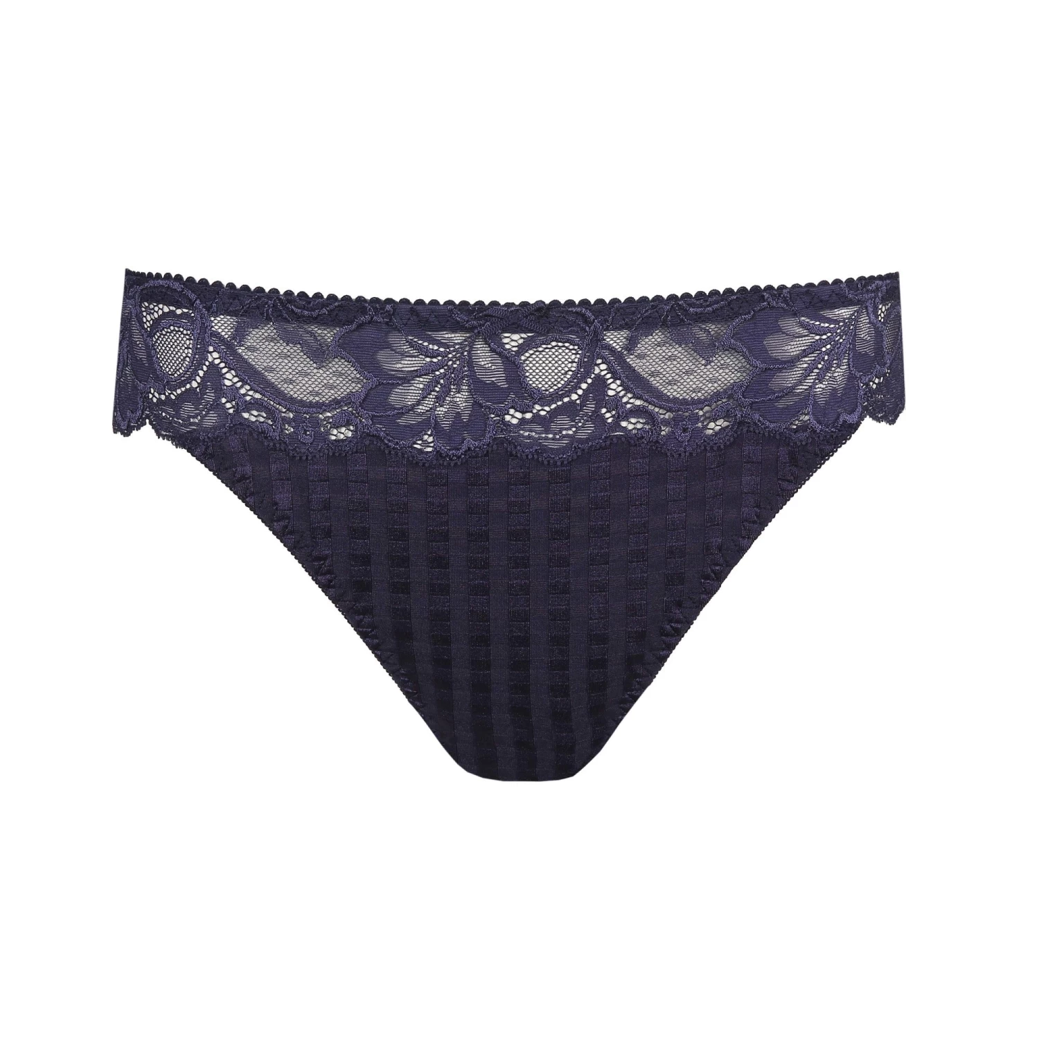 String aus kariertem Stoff mit besonders viel Spitze an der Taille. Aufregend und luxuriös! Bezaubernd zu jedem Teint und für jeden Anlass: das dunkelblaue Bleu Bijou.