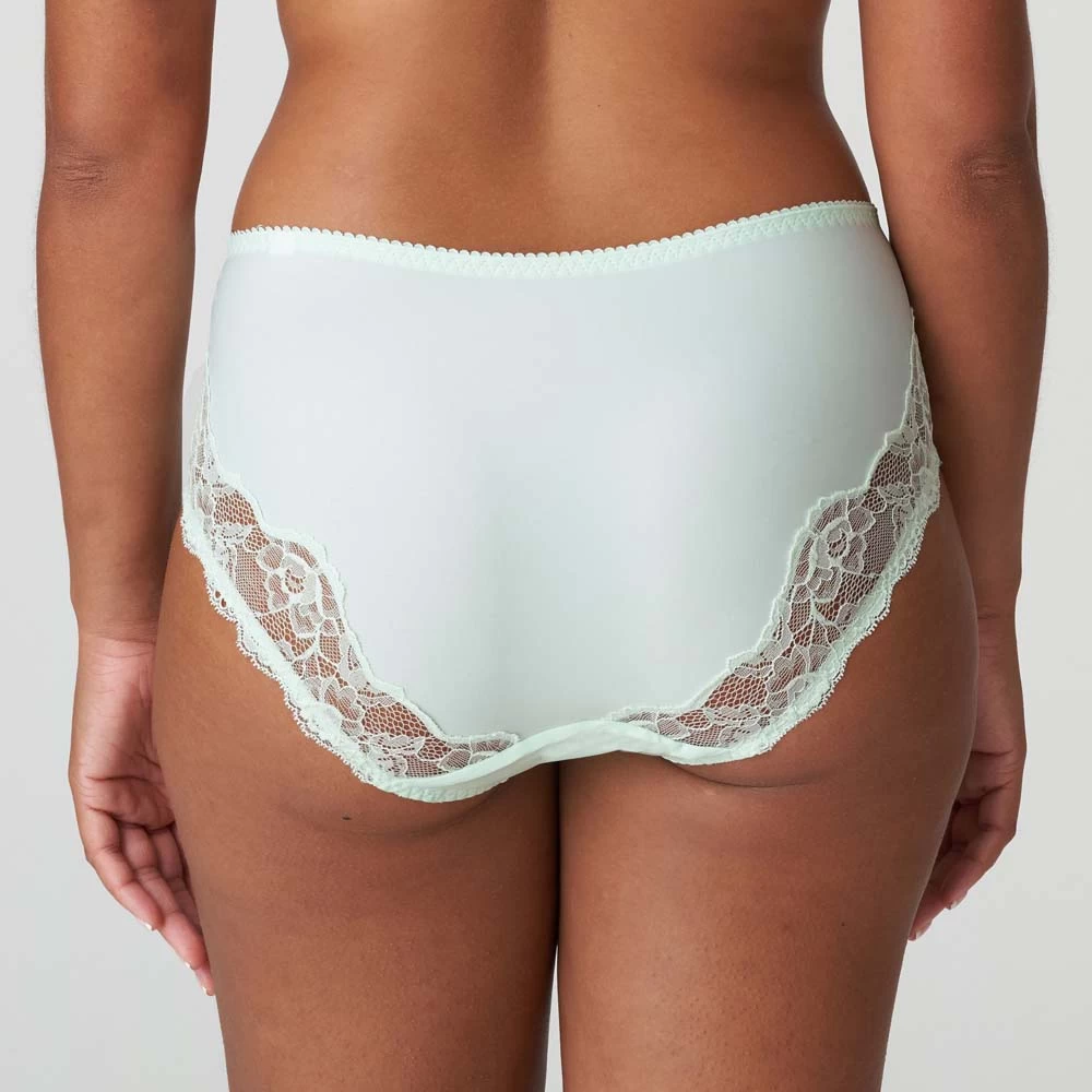 Eleganter und bequemer Taillenslip aus kariertem Stoff und luxuriöser Spitze an den Beinen. Fleur de Printemps ist ein grüner Pastellton, der zu hellen und dunklen Hauttypen sowie unter helle Sommerkleidung passt.
