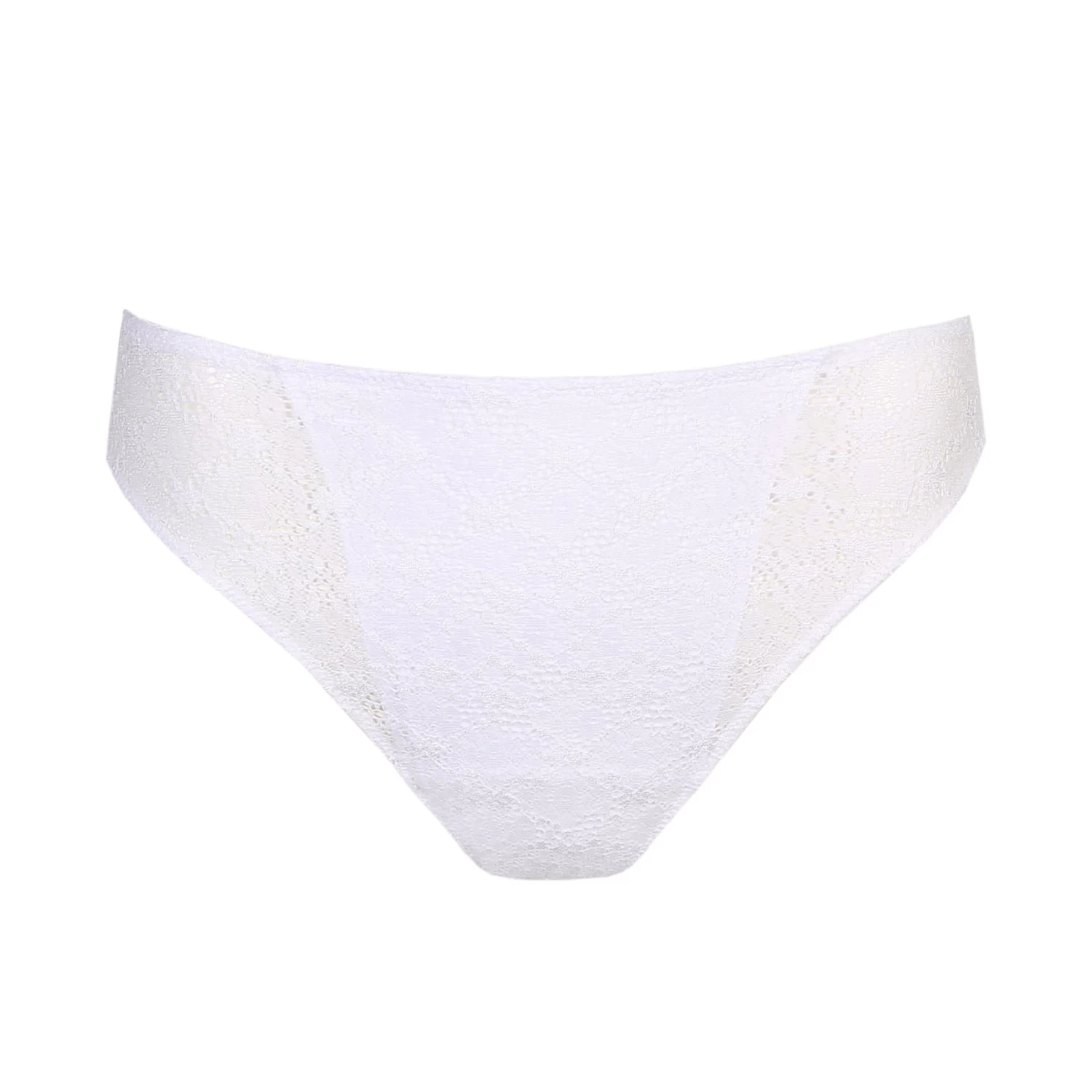 Rioslip aus Vintage-Spitze mit einem einfarbigen Stoff in Satinoptik an der Rückseite. Reizvolle Wimpernspitze am Po rundet den Seventies-Look ab. Vintage-Spitze in frischem Weiß: topmodisch, verführerisch und ein Tipp für Sommerbräute!