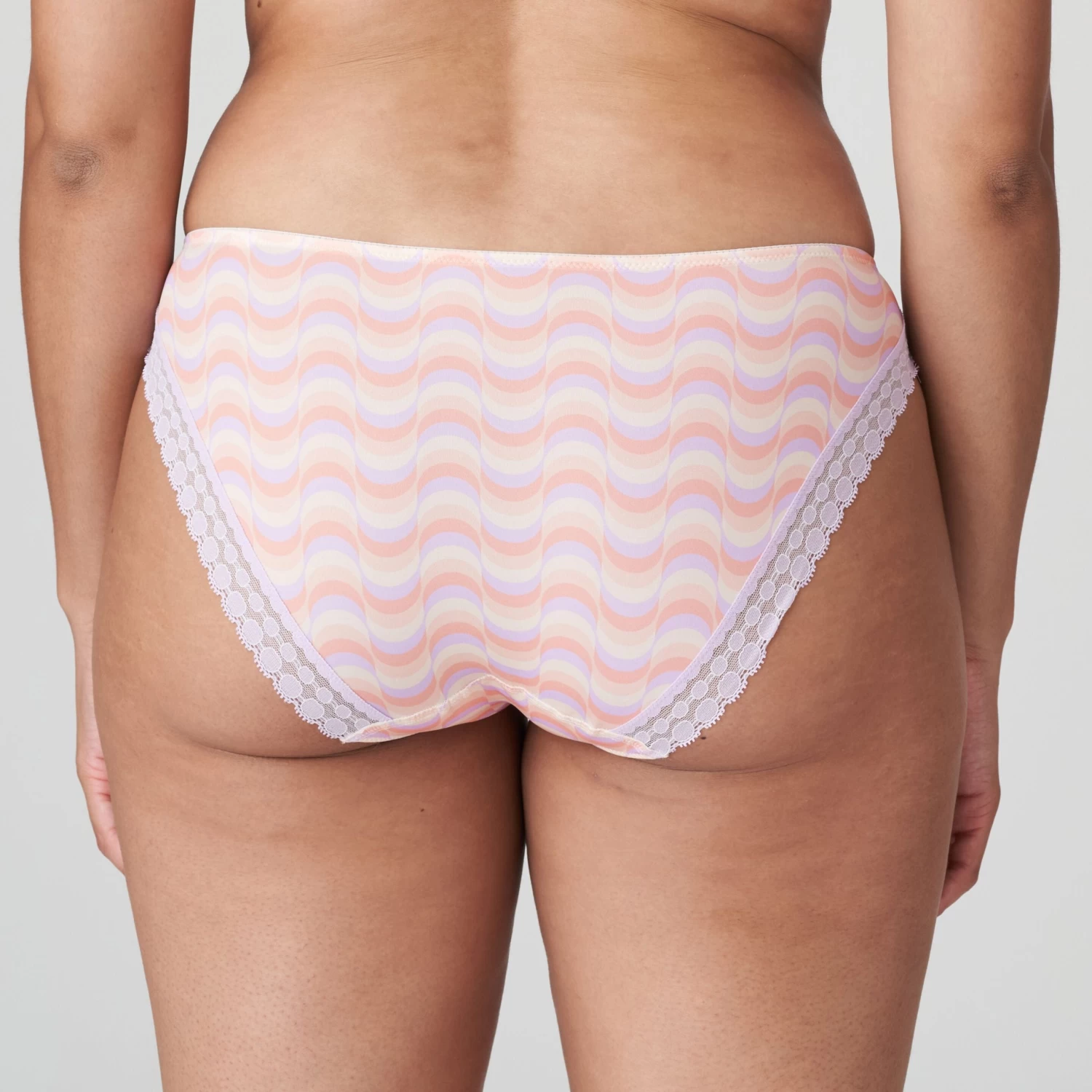 Glatter Rioslip aus einem weichen Stoff mit Seventies-Muster. Feine Spitze an der Taille und an den Beinen gewährleistet, dass der Slip nicht einschneidet. Vintage Summer ist ein Seventies-Motiv in sonnigen Pastelltönen.