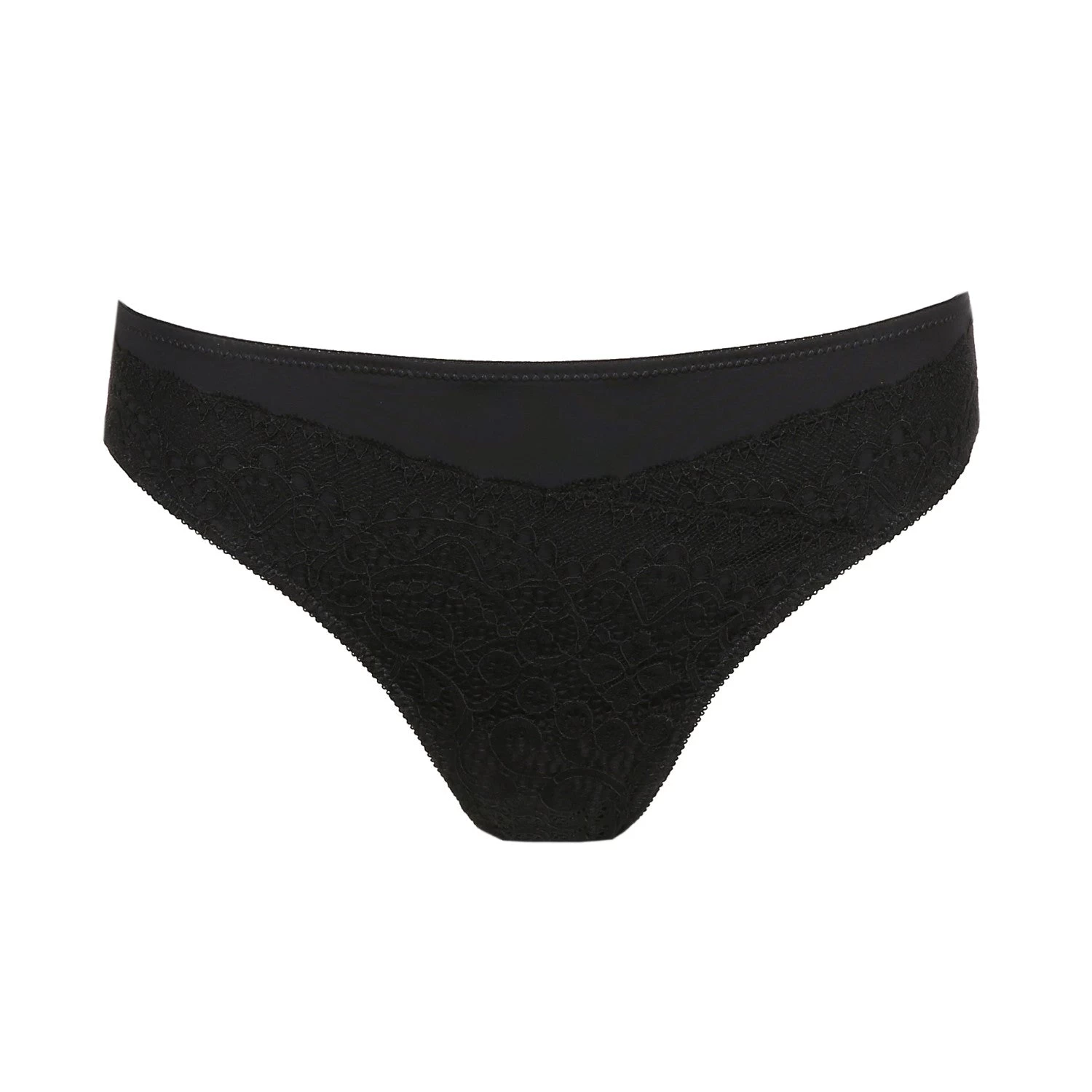 Trendy Rioslip mit Spitze und einem angesagten 90ies-Muster; hinten aus schimmerndem Satinstoff. Schwarze Spitze im Stil der Nineties ist stilvoll und topmodisch zugleich.