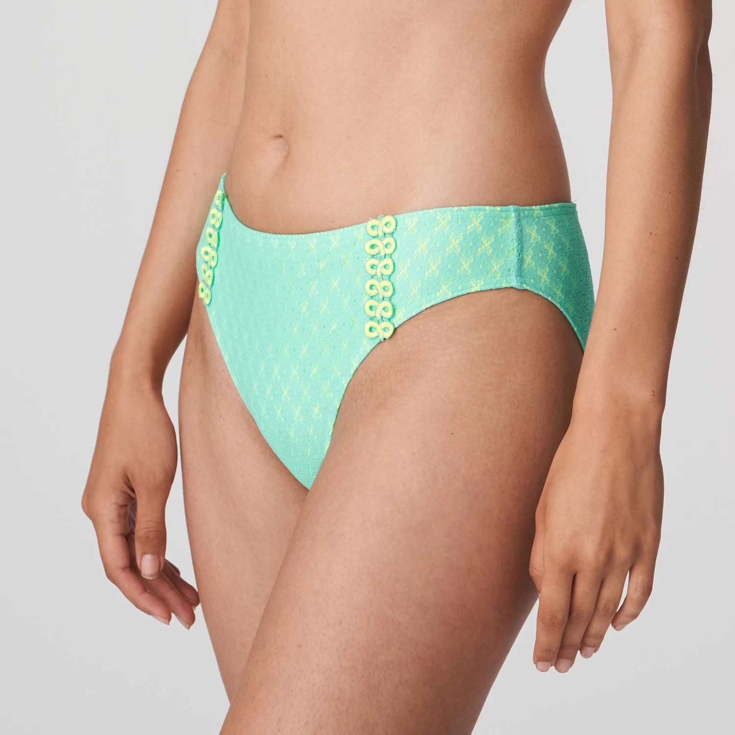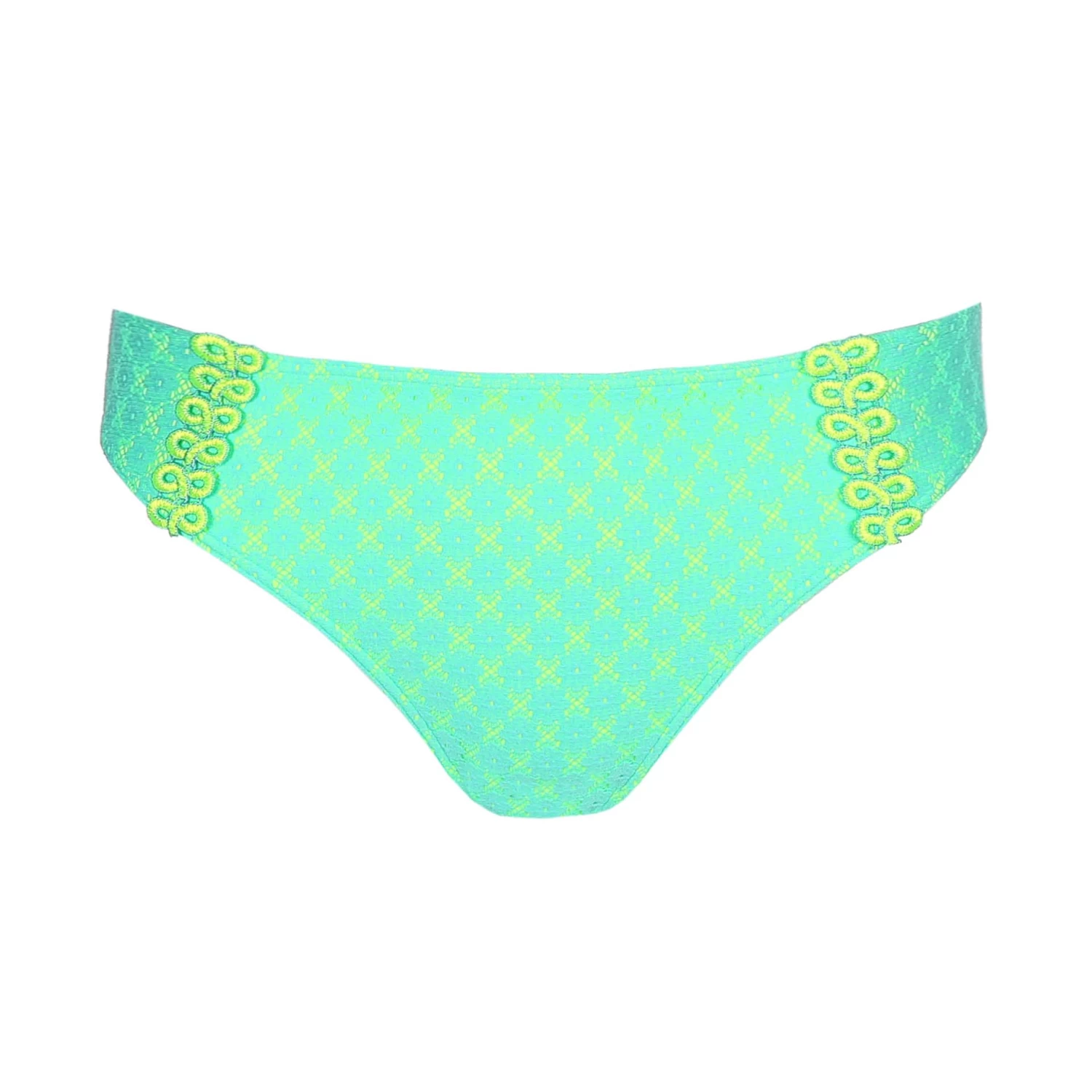 Cooler Bikinislip aus einem zweifarbig gehäkelten Bademodenstoff mit Stickereieinsätzen an der Vorderseite. Aruba ist eine Nuance in frischem Grün mit einem Hauch von knalliger Limette.