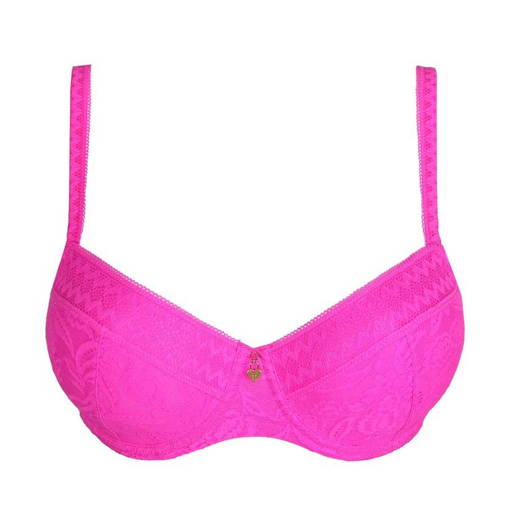 Balconette-BH aus Spitze mit unterlegten Cups und Blumenmuster. Ein grafisches Spitzenmuster umrahmt Ihr Dekolleté und geht elegant in die Träger über. Der knallige Pinkton Cactus Flower und die angesagte Retro-Spitze sind eine echte Traumkombi.