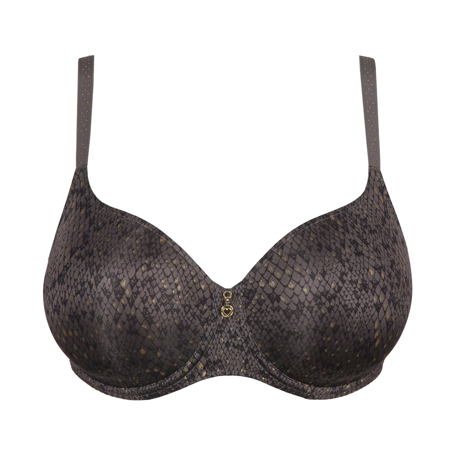 T-Shirt-BH mit herzförmigen gepolsterten Cups, mit glänzendem Stoff in Schlangenleder-Optik überzogen. Die Träger sind mit goldenen Nieten verziert. Kitten Grey ist ein angesagtes Schlangenmuster in schmeichelndem Dunkelgrau und Schwarz.
