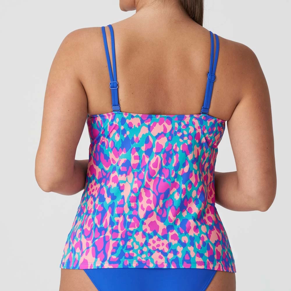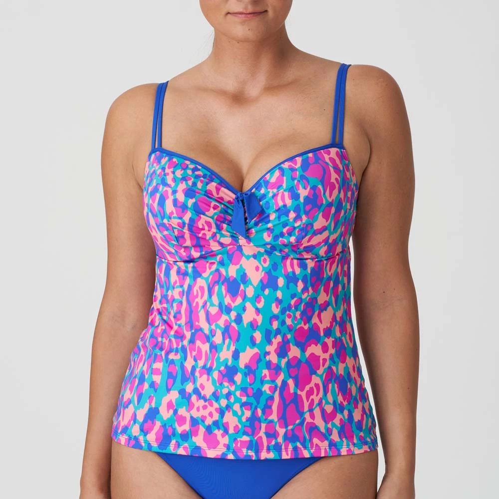 Sommerlicher Tankini mit farbenfrohem Camouflage-Muster und einfarbigen Paspeln am Ausschnitt. Eine große Schleife am Steg und feine Spaghettiträger bilden das i-Tüpfelchen Ihres Strandlooks. Electric Blue ist eine warme Mischung aus Fuchsia und frechen Pinktönen, die eine umwerfende Einheit bilden.