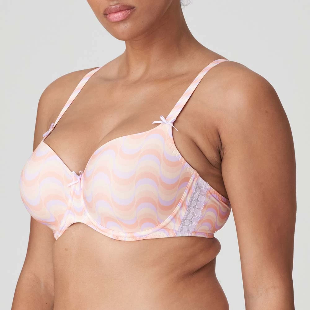 T-Shirt-BH mit herzförmigen gepolsterten Cups, überzogen mit einem weichen Stoff mit Seventies-Motiv. Mit spitzenbesetzen Seitenstegen. Die Träger sind vollständig mit dem gemusterten Stoff überzogen. Vintage Summer ist ein Seventies-Motiv in sonnigen Pastelltönen.